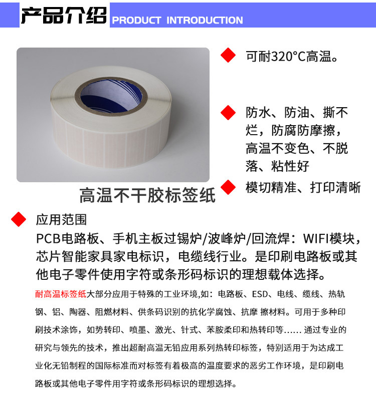 耐高溫標(biāo)簽具有不脫落、不變形、不變色、防火、防油、防水、耐磨抗、耐化學(xué)腐蝕等多項(xiàng)優(yōu)點(diǎn) ;大部分應(yīng)用于特殊的工業(yè)環(huán)境,如:電路板、ES電腦主板,手機(jī)主板,PCB電路在過(guò)波峰爐,回流焊中標(biāo)識(shí)耐高溫條碼標(biāo)簽。