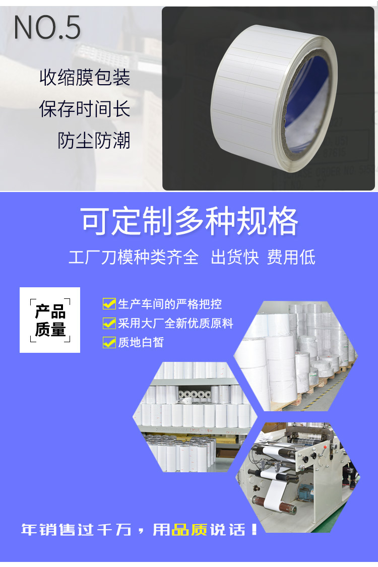 耐高溫條碼標(biāo)簽可按客戶要求生產(chǎn)。按厚度分有25番(1番=1um)、50番、75番等規(guī)格,這與廠家的實(shí)際要求有關(guān)。由于PET優(yōu)良的介質(zhì)性能,具有良好的防污、防刮、耐高溫等性能,它被廣泛應(yīng)用于多種特殊場(chǎng)合,如在高溫條件下生產(chǎn)的電子產(chǎn)品、手機(jī)電池、電腦顯示器、空調(diào)壓縮機(jī)等。需要使用碳帶,熱轉(zhuǎn)印方式打印,打印質(zhì)量較高。